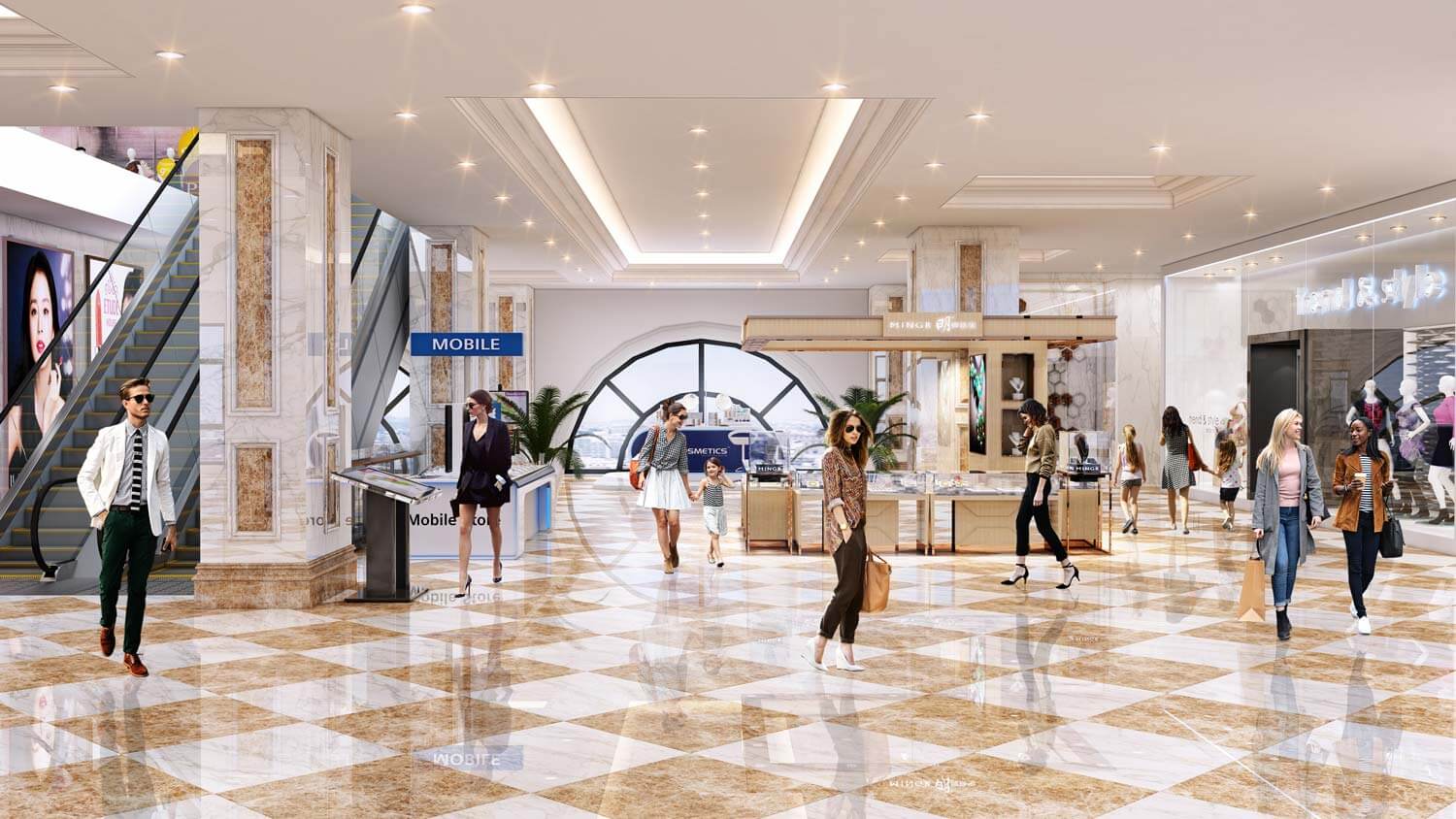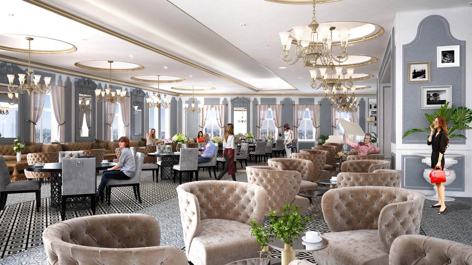 Caption gợi ý: Đại sảnh sang trọng mang phong cách kiến trúc Pháp.